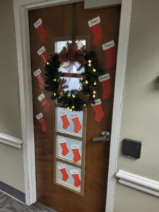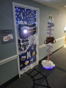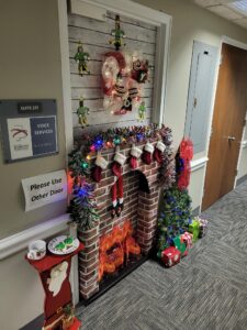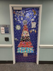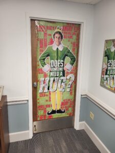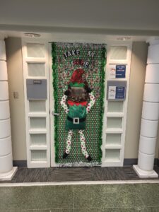 Taking inspiration from the classic Christmas carol “Deck the Halls,” staff were invited to deck out their individual office doors with festive seasonal displays. Each department within OIT was also encouraged to decorate their main office door as a group and enter it in the official OIT Holiday Door Decorating Contest. While there were numerous fantastic door entries, a panel of unbiased judges from external agencies chose one that stood out from the rest – way to go Voice Services! (fireplace themed door in photos below)
